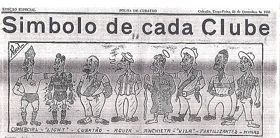 Símbolo de cada clube cubatense, em charge de Raul José Sant'Anna Leite, publicada na edição especial do jornal Folha de Cubatão de 25