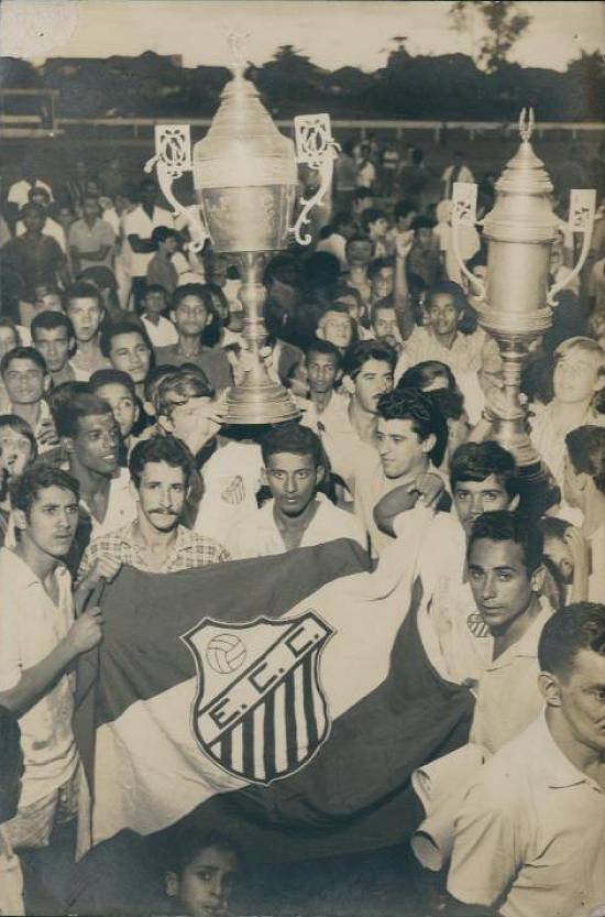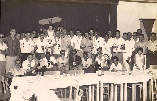Comemoração do campeonato de 1959 no Esporte Clube Cubatão, tendo em pé, da esquerda para a direita: Luciano, Carlinhos, Nico, Antonio Lopes, Dudu, Farid,