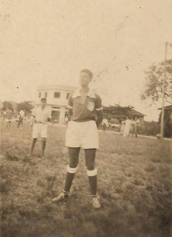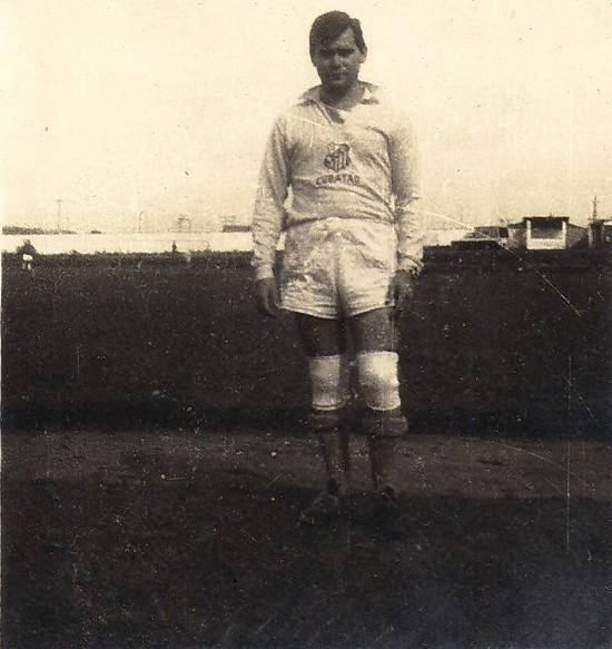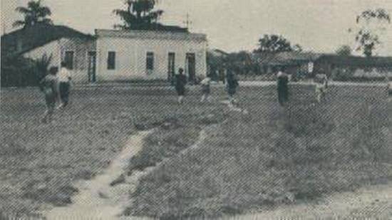 Campo do Esporte Clube Cubatão em 1954 (perto do Bar-Armazém de Dona Rosa e tendo ao fundo a Padaria Castelões), tendo em primeiro plano o jogador Roberto