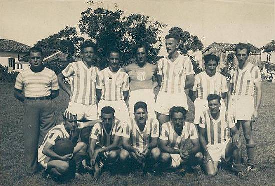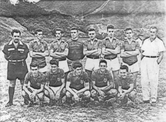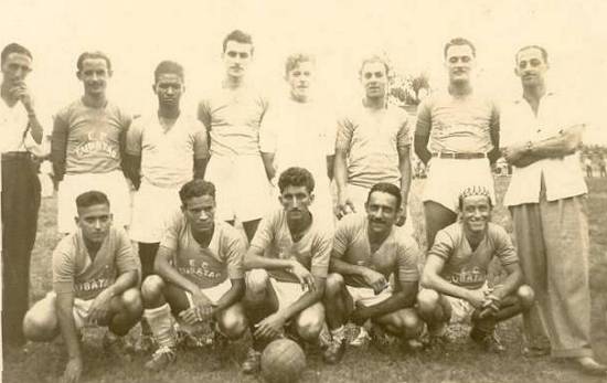 Time do Esporte Clube Cubatão em 1948. Da esquerda para a direita, de pé, o técnico Rômulo Buzatti, Bube, Taboca, Abílio, Manecão, Quincas e Lindoro;