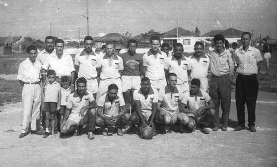 Time do Departamento de Estradas de Rodagem (DER) em 1959: em pé, da esquerda para a direita, Primo Ambrósio, Anfelino, Anibal (com os filhos Anibinha e