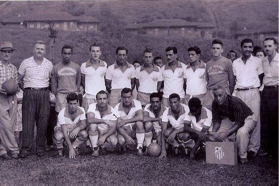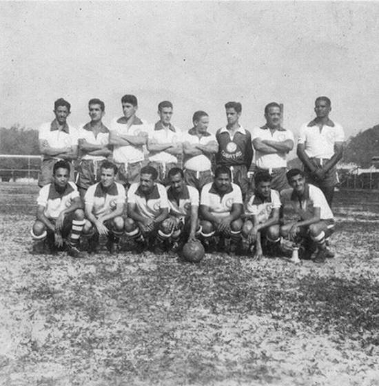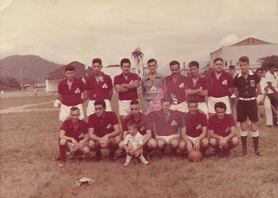 Time da Companhia Santista de Papel em 1956. Da esquerda para a direita, em pé: Chico, Zé Teixeira, Arlindo, Arnaldo, Lica, Chiquinho Castro, Raul e Bento;