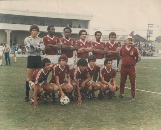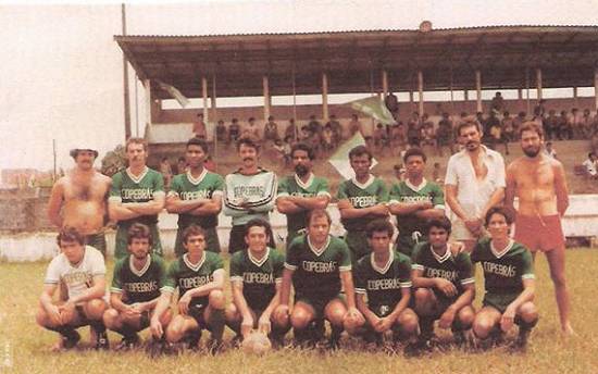 Time da empresa Copebrás em 1982. De pé, da esquerda para a direita: Pezão, Alemão, Santos, Clayton, Serginho, Cícero, Ivan, Buck e Cláudio; agachados: