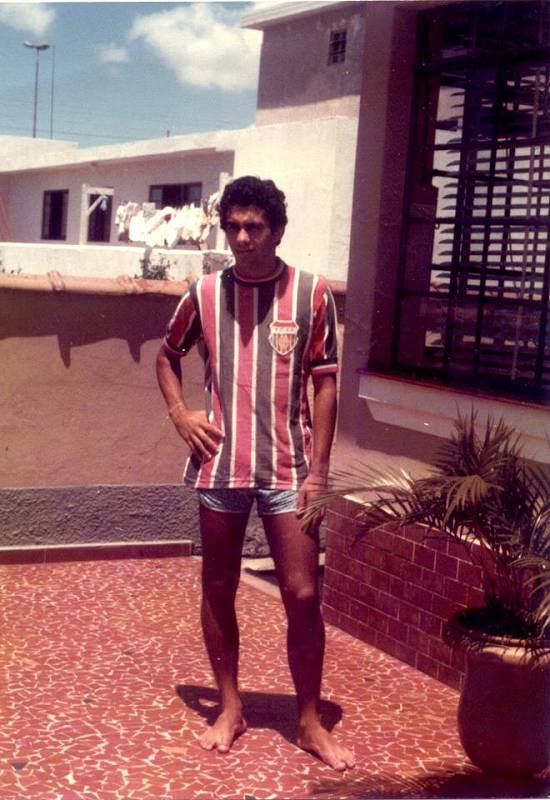 Jogador Edivaldo Pita, na casa dos pais, com a camisa do Esporte Clube Jardim Casqueiro