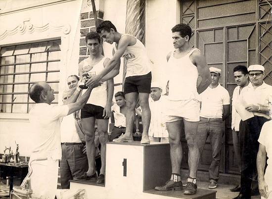 Entrega do Troféu Prova Ciclística, em 1960. Junto à porta, Nelson Nunes Azevedo. Entregando o troféu, o sr. Santana. Como vice-campeão, Orandir Anhas