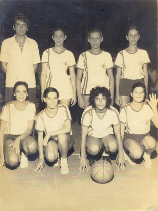 Time de Basquete Feminino de Cubatão em 1972, com o técnico Antonio Lombardi (Toninho Madrugada), Cida Ribeiro, Ana, Mirtes Cruz, Vera Lúcia Esteves, Inês