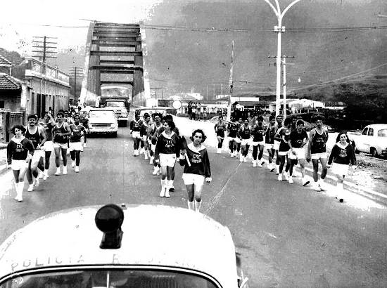 Abertura dos Jogos Regionais em 1968, na Avenida Nove de Abril, junto à Ponte do Arco-Íris. Na fila da esquerda, o quarto integrante identificado como Neco