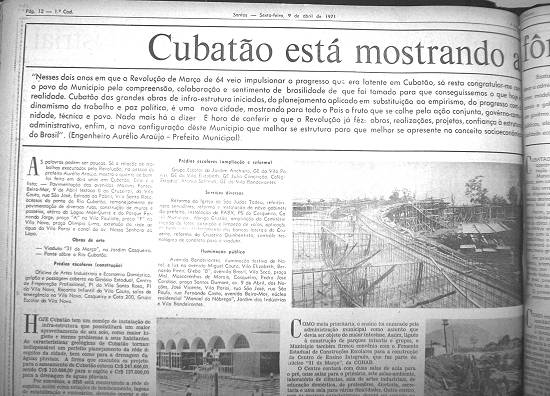 população do bairro do Casqueiro e que, dentro de 3 meses, verá realizado o sonho. O Viaduto 31 de Março, projetado e executado nessa gestão, é o símbolo do desenvolvimento de Cubatão.