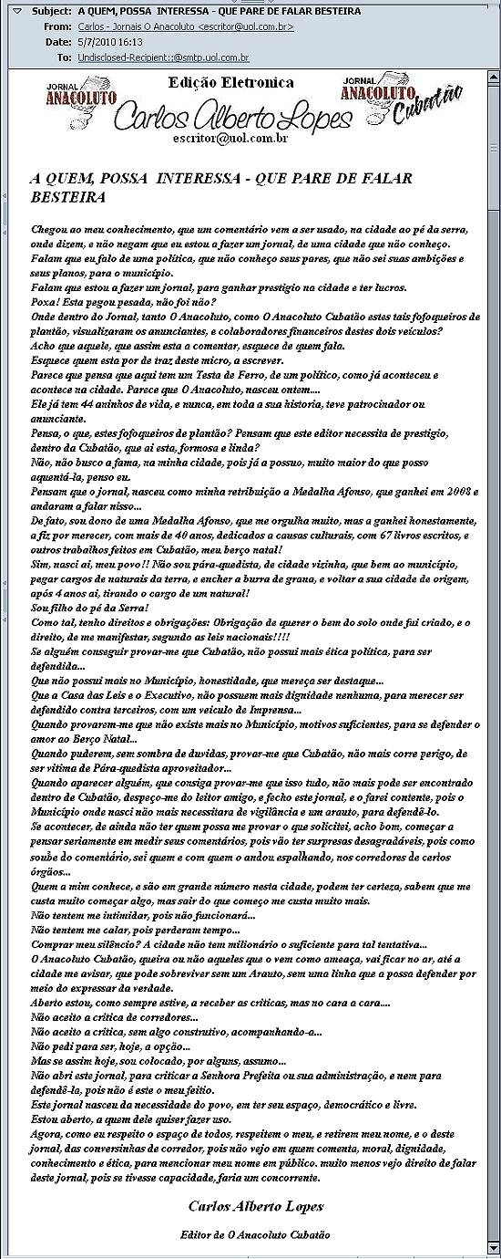 O Anacoluto Cubatão, queira ou não aqueles que o vem como ameaça, vai ficar no ar, até a cidade me avisar, que pode sobreviver sem um Arauto, sem uma linha que a possa defender por meio do expressar da verdade.