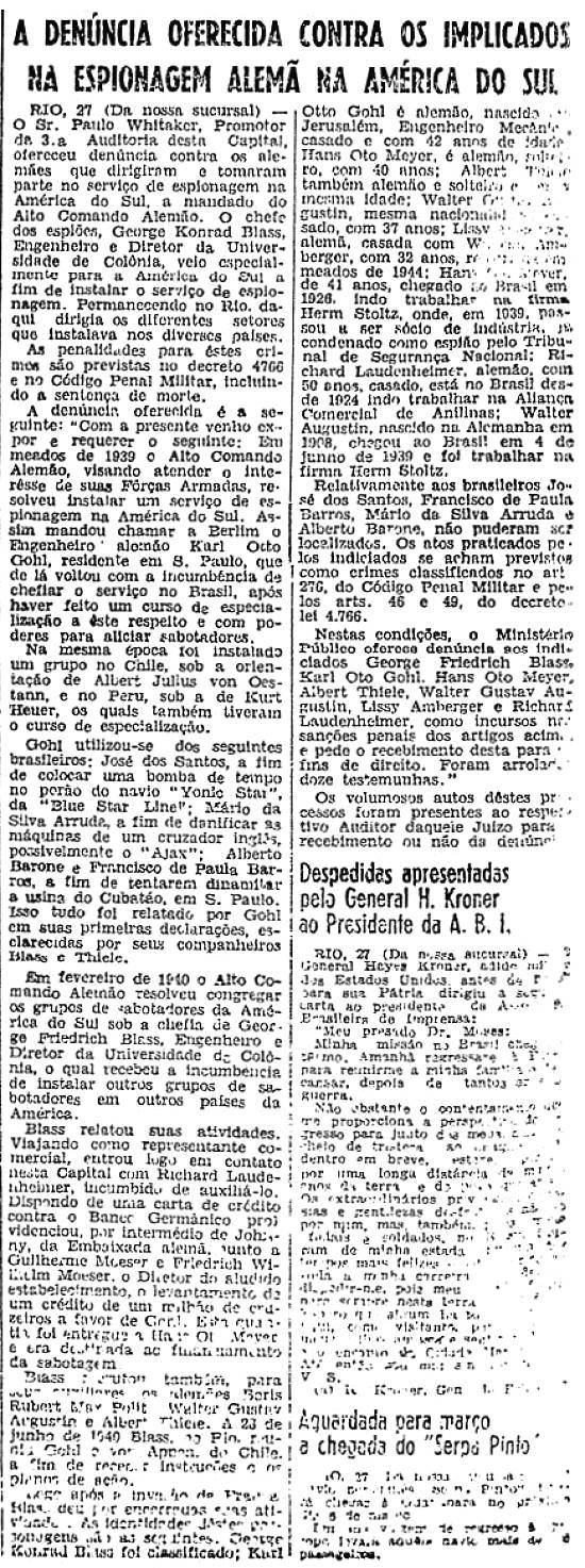 RIO, 27 (Da nossa sucursal) - O sr. Paulo Whitaker, promotor da 3ª Auditoria desta Capital, ofereceu denúncia contra os alemães que dirigiram e tomaram parte no serviço de espionagem na América do Sul, a mandado do Alto Comando Alemão. O chefe dos espiões, George Konrad Blass, engenheiro e diretor da Universidade de Colonia, veio especialmente para a América do Sul a fim de instalar o serviço de espionagem. Permanecendo no Rio, daqui dirigia os diferentes setores que instalava nos diversos países.