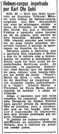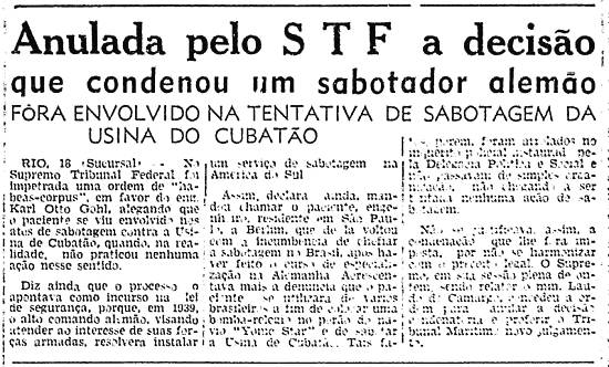RIO, 28 - Karl Oto Gohl impetrou ao Supremo Tribunal Federal uma ordem de habeas-corpus, alegando que fora denunciado por atos de sabotagem contra a usina de Cubatão, no Estado de São Paulo. Diz que o Ministério Público o apontou como incurso na lei de guerra, pois servira ao Alto Comando Alemão que, em 1939, visando atender aos interesses de suas forças armadas, resolvera instalar o serviço de espionagem na América do Sul.