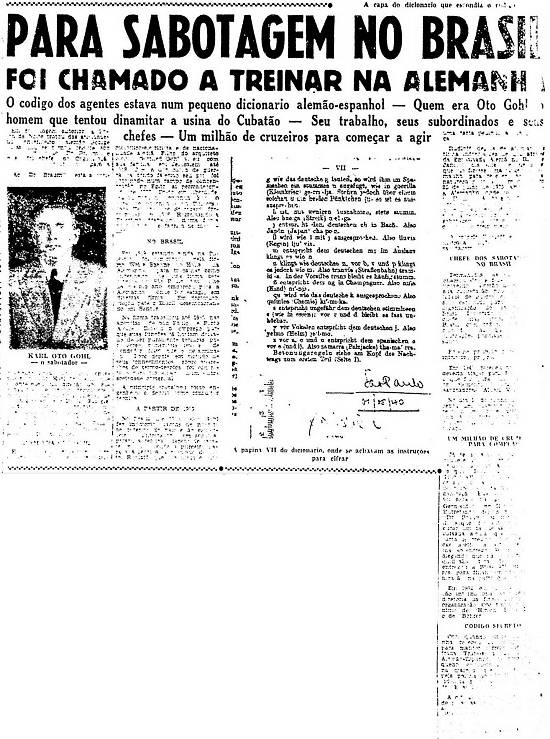 Os arquivos do grupo Folha guardam ainda o exemplar de 30 de maio de 1949 do jornal paulistano Folha da Noite, que na página 20 apresenta matéria sobre o tema, ilegível. A matéria apresenta a capa do dicionário usado pelo grupo sabotador para camuflar seus códigos, a página VII desse dicionário, com as instruções para cifrar e uma foto de Karl Oto Gohl: