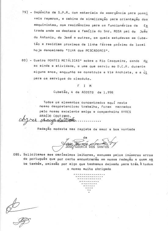 que muito se dedicaram e contribuíram nas construções dessas mesmas edificações as quais serviram como início da fundação de Cubatão, como foi por