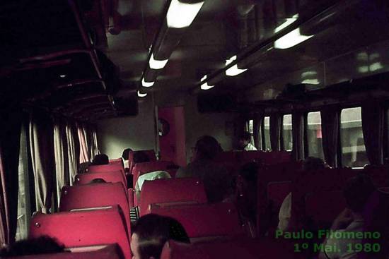 Interior de vagão do trem húngaro, em 1º de maio de 1980