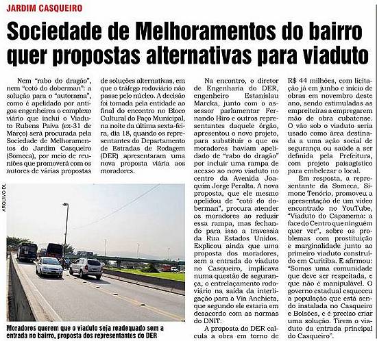 propostas foram apresentadas, como a de fazer a nova alça do viaduto sair da Rua 1 do Jardim Casqueiro, sobre a caneleta, sem criar um viaduto, sugerida por um aluno de Arquitetura, e a de Valdemar Alves dos Santos, apresentada em desenho, tendo