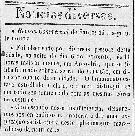 "Foi observado por diversas pessoas desta cidade, na noite do dia 6 do corrente, às 11 horas mais ou menos, um arco-íris, que se tinha formado sobre a serra do Cubatão, em direção Oeste desta cidade.