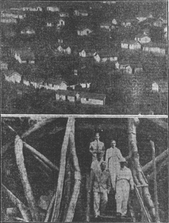 Ao alto, vista de um dos acampamentos de operários da Via Anchieta; em baixo, o repórter da "Agência Nacional" em companhia de engenheiros do