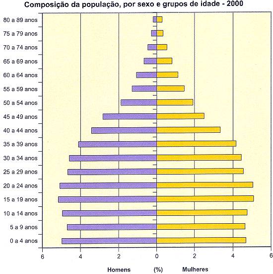 de homens e uma estrutura populacional formada principalmente por adultos (25 a 64 anos). Observando-se a pirâmide etária, verifica-se um maior número de pessoas na faixa de 15 a 19 anos.