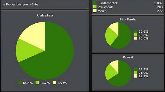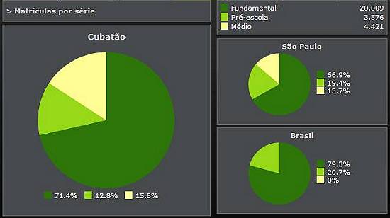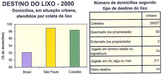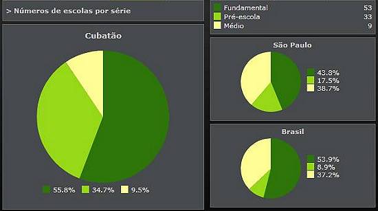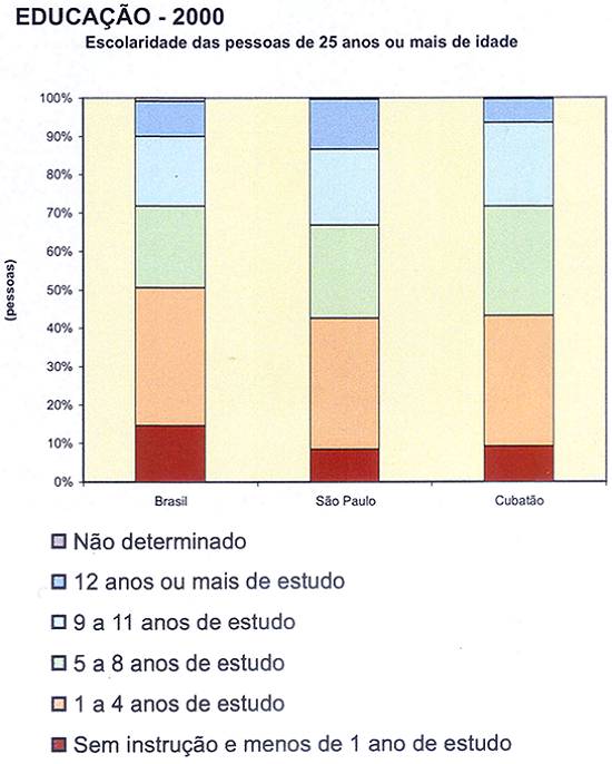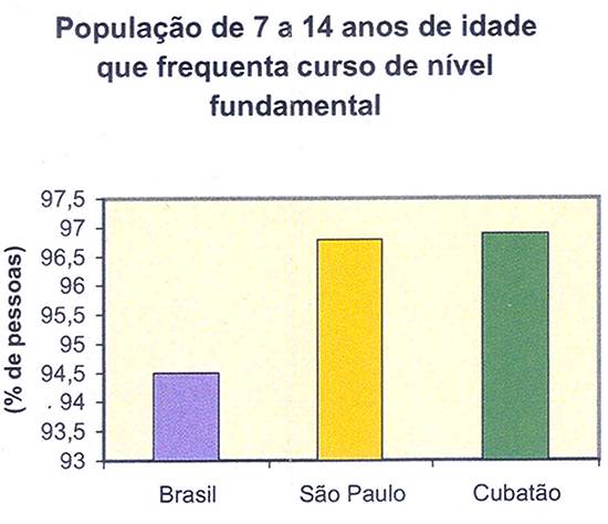 Quanto aos indicadores de educação, Cubatão tinha, em 2000, 96,89% de pessoas freqüentando curso de nível fundamental (considerando a parcela da população entre 7 e 14 anos de idade), o que o coloca em situação
