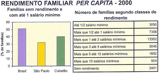 No que se refere ao rendimento familiar per capita, Cubatão possuía, em 2000, a maior parte de suas famílias concentradas na classe "mais que 1 até 3 salários mínimos" (41,92%), seguida da classe "mais que