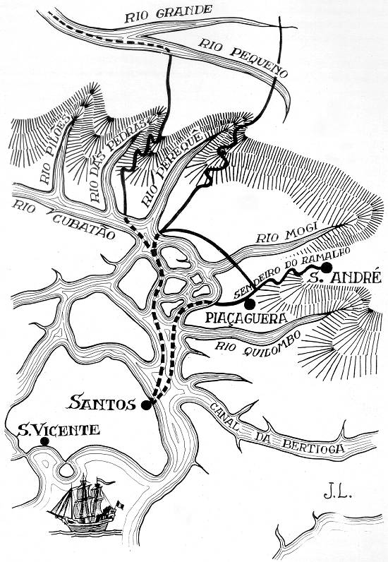 João Belbode Maldonado, o Ramalho, foi o primeiro homem branco a transpor a serra de Paranapiacaba e entrar pelo planalto, onde a terra se apresenta empolada de colinas, coberta de vegetação franzina e pobre. De novo, na trilha dos índios, lá foram eles em fila, um atrás do outro, naquele passo elástico em que podiam caminhar dia e noite sem se cansar, vencendo com rapidez consideráveis distâncias.