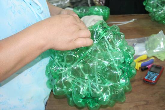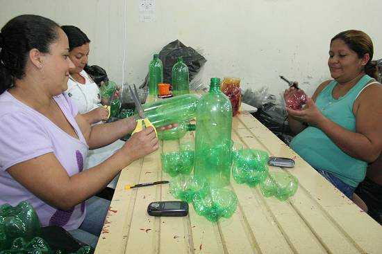 Assim que as garrafas chegam, são selecionadas; tiram-se os rótulos e tampas. Em seguida passam pelo processo de lavagem. São separadas por cores e cortadas. Daí começa a produção da peça escolhida. Depois de prontas, algumas são pintadas e outras recebem o acabamento com lâmpadas pisca-pisca.
