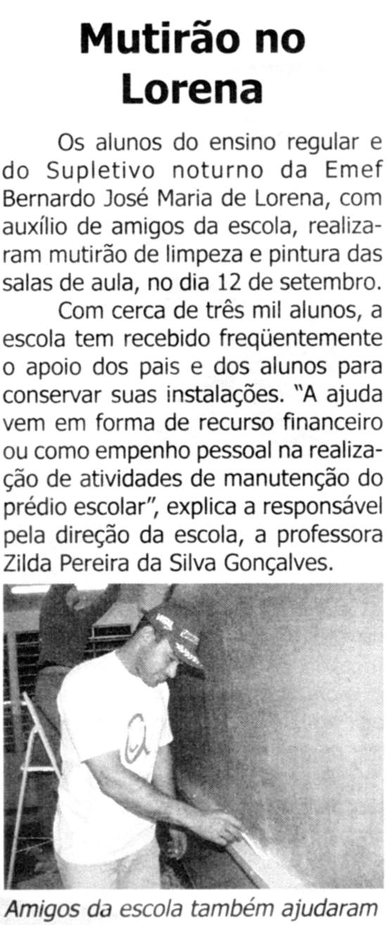 Um mutirão de pintura, limpeza e organização das salas de aula será promovido no dia 12 de setembro, das 19 às 23 horas, na Escola Municipal de Ensino Fundamental Bernardo José Maria de Lorena (Av. Nossa Senhora da Lapa, 785, bairro Vila Nova, em Cubatão). Esse trabalho será realizado pelos alunos do Curso Supletivo, com apoio do grupo Amigos da Escola, que também doou os materiais necessários para esta fase da campanha.