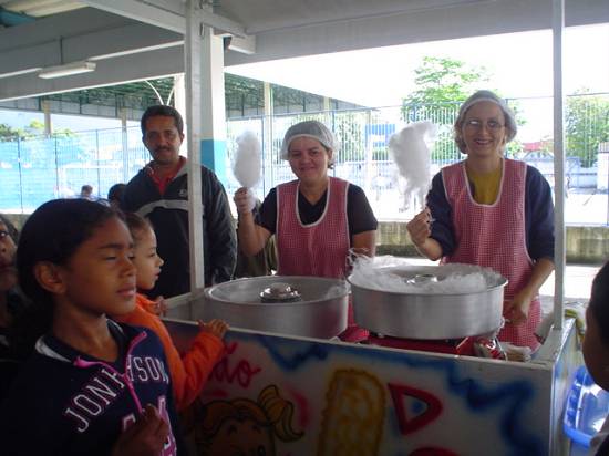 As crianças tiveram um período de recreação especial no pátio da escola, com distribuição de algodão-doce e outros produtos: