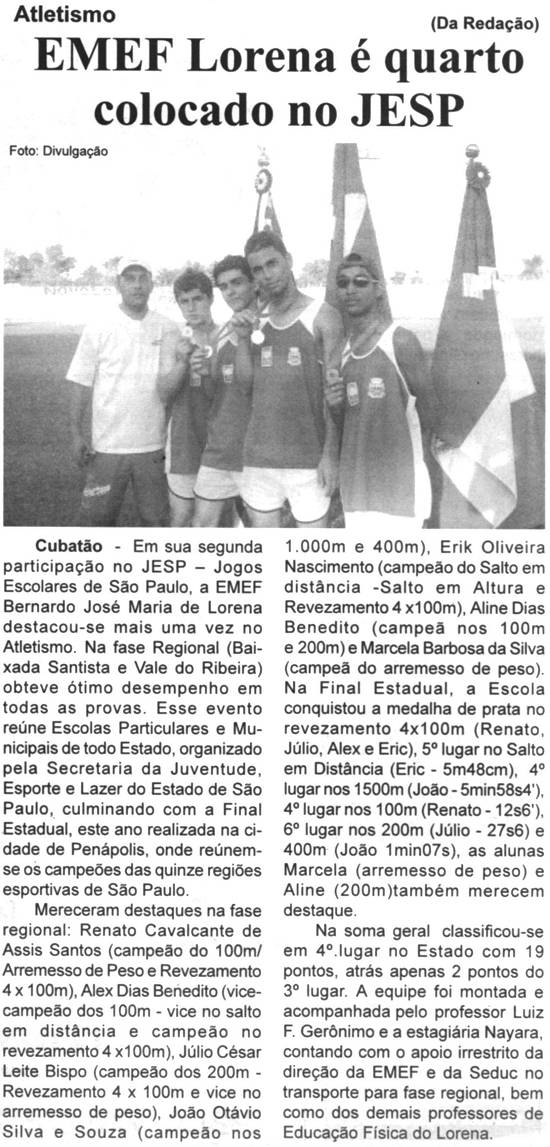 Cubatão - Em sua segunda participação no JESP - Jogos Escolares de São Paulo, a EMEF Bernardo José Maria de Lorena destacou-se mais uma vez no Atletismo. Na fase Regional (Baixada Santista e Vale do Ribeira) obteve ótimo desempenho em todas as provas. Esse evento reúne Escolas Particulares e Municipais de todo Estado, organizado pela Secretaria da Juventude, Esporte e Lazer do Estado de São Paulo, culminando com a Final Estadual, este ano realizada na cidade de Penápolis, onde reúnem-se os campeões das quinze regiões esportivas de São Paulo.