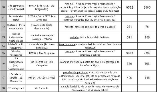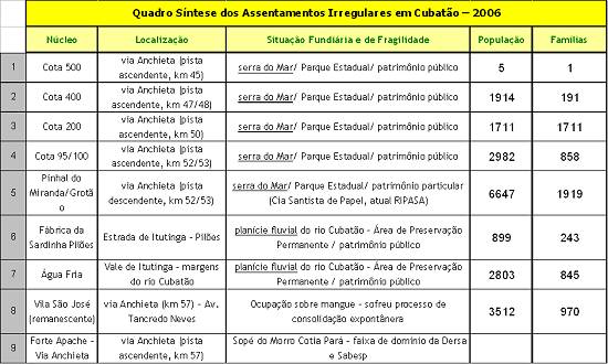Os assentamentos irregulares em Cubatão são caracterizados principalmente por estarem localizados em áreas de proteção ambiental, podendo ser classificados em três tipos: 1. Encostas 2. Várzea 3. Mangues