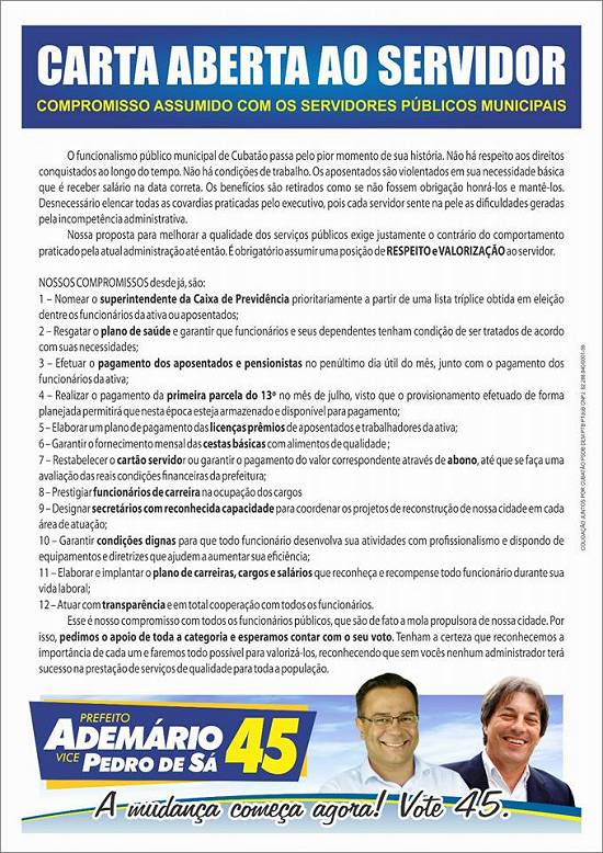 Panfleto de campanha: compromisso do candidato junto aos servidores públicos municipais