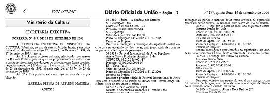 448 do Ministério da Cultura, de 13 de setembro de 2006, publicada no Diário Oficial da União em 14/9/2006, nº 177, seção 1, páginas 6/7 :