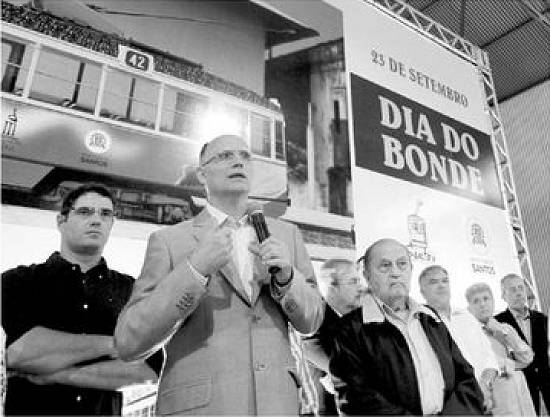 João Paulo Tavares Papa (PMDB), durante as comemorações do 11º aniversário da volta do meio de transporte às ruas centrais de Santos. O equipamento,