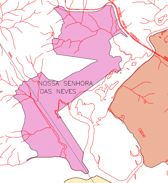 na lei de abairramento de Santos. Linhas vermelhas finas são a rede hidrográfica, linhas vermelhas paralelas indicam a Rodovia Cônego Domênico