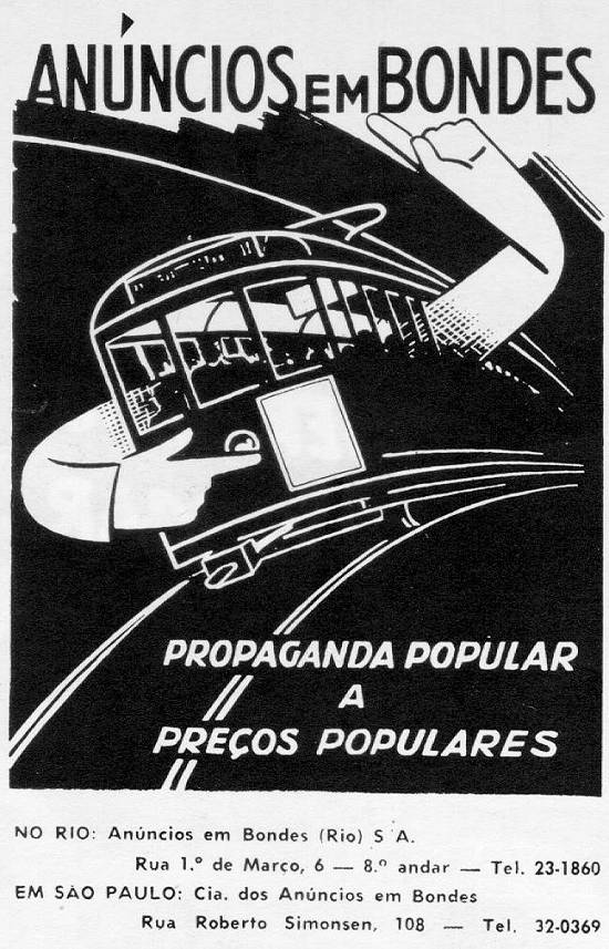 No início, os passageiros se revoltaram quando os bondes começaram a ostentar publicidade interna e externa. Depois, se acostumaram com os painéis de propaganda, e surgiram empresas especializadas em anúncios nos bondes nacionais, como a que assim anunciou em fevereiro de 1953, no Anuário de Publicidade, editado no Rio de Janeiro: