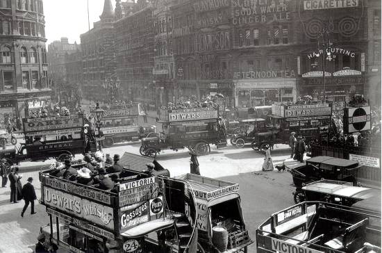 Enquanto isso, em Londres, com o fim dos veículos de tração animal, os ônibus já começavam a congestionar as avenidas (imagem abaixo), prenunciando a ameaça que em muitas dessas cidades os serviços de bondes teriam de enfrentar.