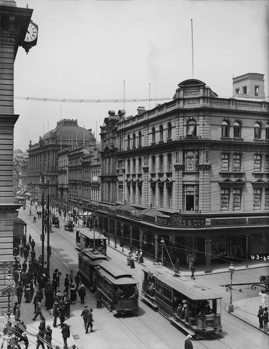 Esquina de ruas George e David Jones, em Sydney South, cerca de 1900