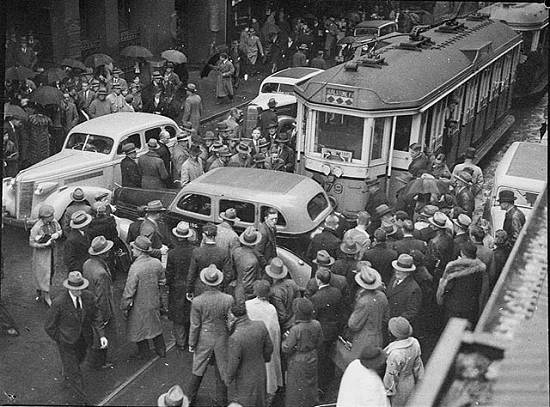 Bonde (à direita) na Praça da Ferrovia (Railway Square), em Sydney, cerca de 1945