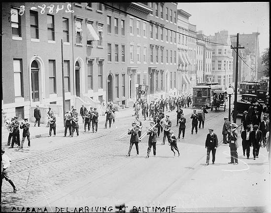 Bondes retidos pelo desfile da chegada da delegação do Alabama a Baltimore, entre 1910 e 1915, nas ruas Eager e Charles, olhando-se em direção ao Sul. Ao fundo, uma grande estrutura em pedra é o Maryland Club