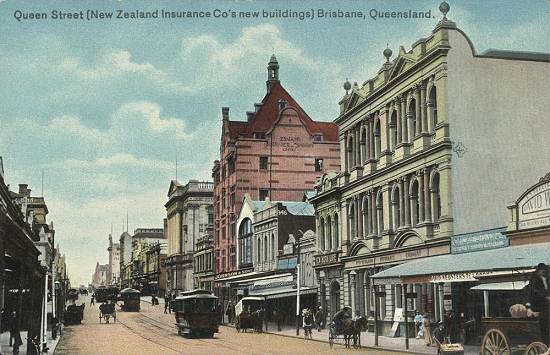 Bondes passando defronte aos novos edifícios da New Zealand Insucrance Company situados na ponta Norte da Queen Street, intersecção com Rua Wharf, no centro de Brisbane, cerca de 1906