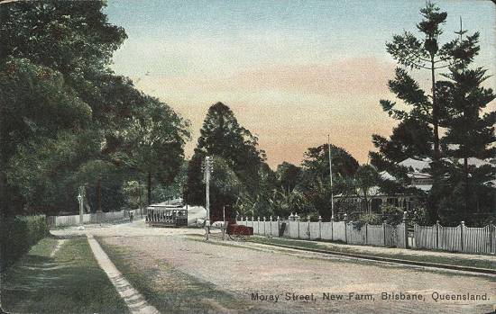 Bonde na Rua Moray, no subúrbio de New Farm, em Brisbane, no início do século XX
