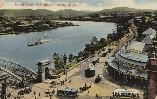 Bondes elétricos em North Quay e Milton Reach junto ao Rio Brisbane, cerca de 1906, vendo-se a entrada da Ponte Victoria