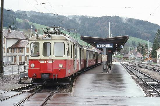 de Appenzellerbahn, na Suíça. A linha de 59,7 km com bitola métrica foi construída entre 1875 e 1912.