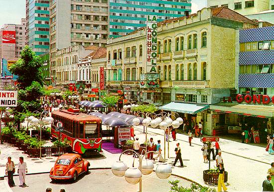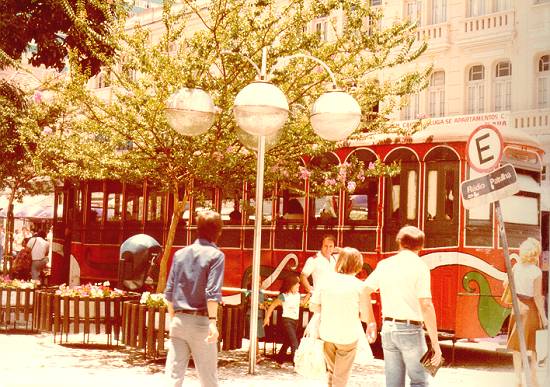 Avenida Luiz Xavier com a Rua 15 de Novembro (Rua das Flores), este bonde - que antes circulou pelas ruas de Santos/SP - é uma das atrações