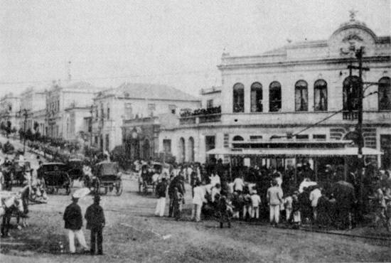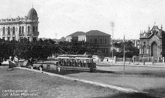 Acima, em postal do início do século XX, vê-se vários bondes elétricos circulando