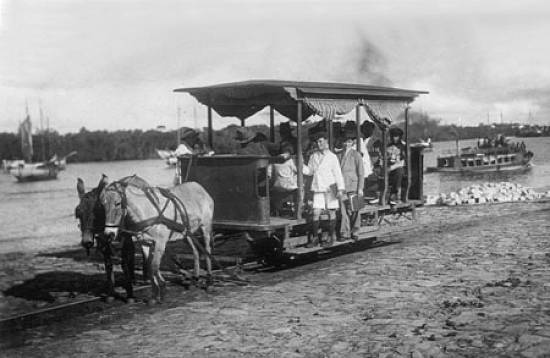 Na foto, o bonde com tração animal na cidade portuária paranaense de Paranaguá, penúltimo sistema do gênero a ser desativado no Brasil, em 1938 (o último foi o da cidade de Santo Amaro/BA, por volta de 1965).
