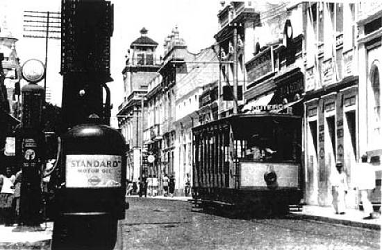 Na foto superior , um bonde elétrico no centro da capital cearense, em meados do século XX. Já a imagem abaixo, da mesma época, mostra o bonde elétrico aberto prefixo 76, na linha do Outeiro, passando ao lado de uma bomba de gasolina.