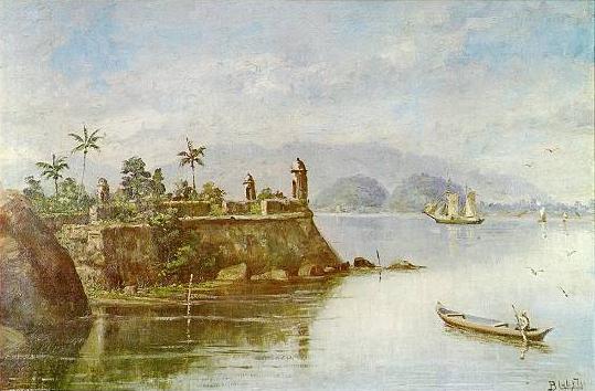 Esse trabalho ("Forte do Itapema e Outeirinhos", não datado, óleo sobre tela, com 40 x 60 cm) faz parte do