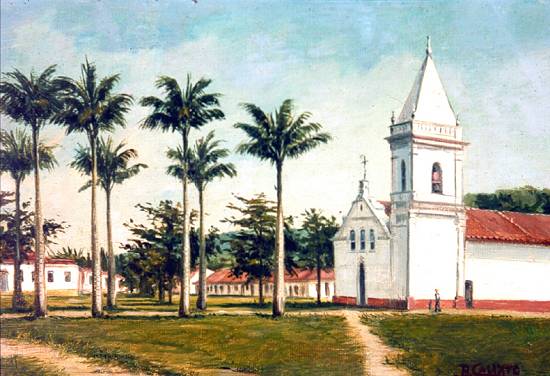 Com o título Igreja de São Sebastião, sem data, este óleo sobre tela de 18x25 cm pertence a uma coleção