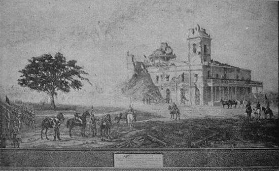 Este pequeno esboço, de Benedito Calixto mostra as ruínas da igreja de Humaitá, na ocasião em que a praça era ocupada pelas forças aliadas, em 25 de julho de 1868, conforme fotografia e documentos da época. Esta foto do quadro, feita por José Marques Pereira, foi publicada em janeiro de 1902: